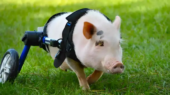 The pig itself is shown mobilizing with the help of a small, custom-built wheelchair made from toys and harnesses, allowing him to walk using only his front legs. The footage highlights a room full of smiling children in small chairs, feeding and petting the pig. The humor of the video hinges entirely on the juxtaposition: the sincere, touching imagery of a disabled animal bringing joy to children directly clashing with the dark humor of naming a pig after cooked pork.
